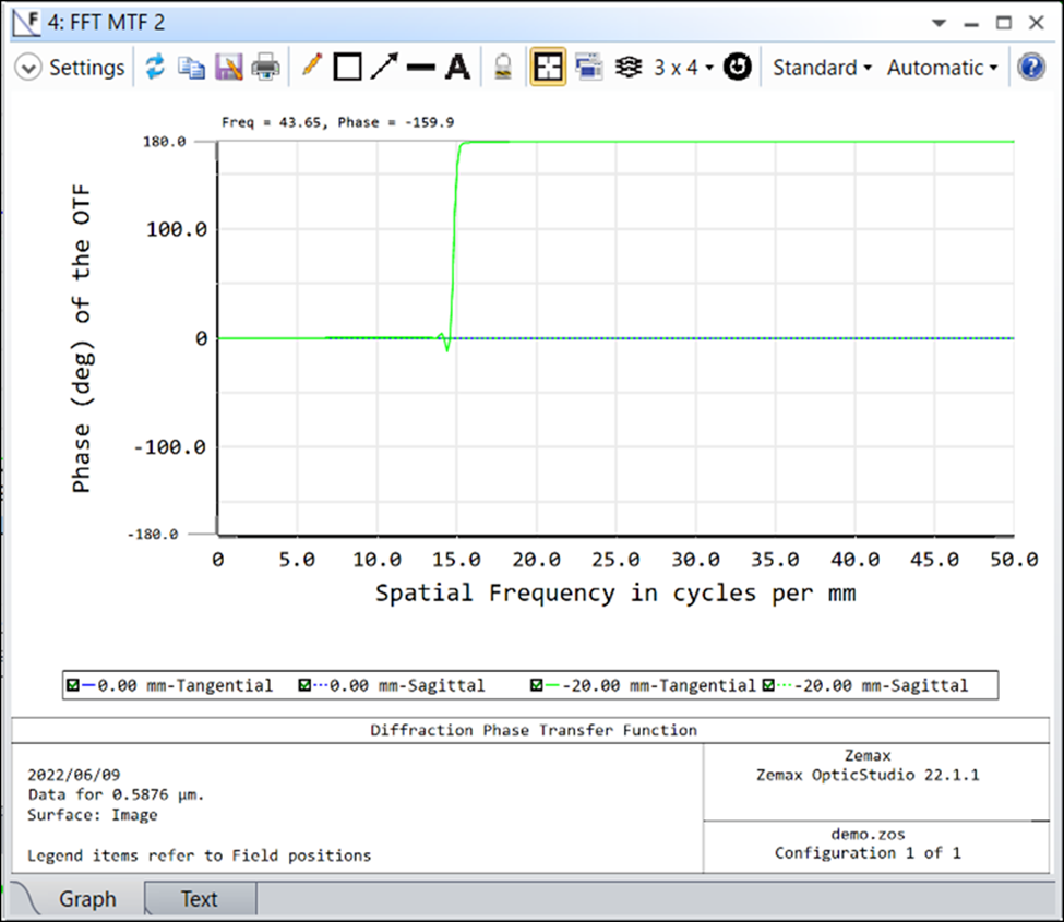 如果在FFTMTF的設(shè)置中將類(lèi)型改為相位,可以發(fā)現(xiàn),在15線/毫米或更多的情況下,相位轉(zhuǎn)為180°。