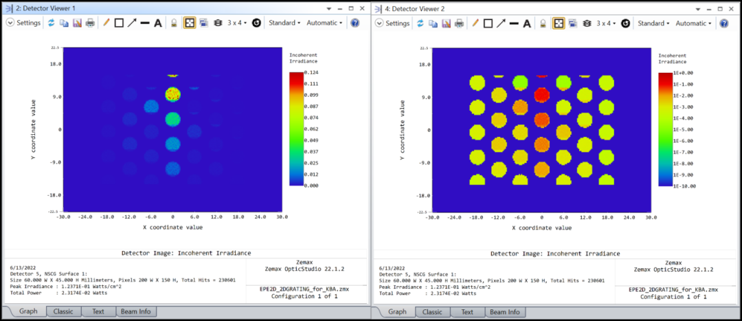 探測器上的光線追蹤結果如下。請注意,兩張圖片顯示的結果相同,但右側是用對數刻度。