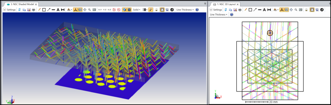 打開這個文件時,我們應該看到兩個Lumerical FDTD被打開,只要OpticStudio。這是因為該系統(tǒng)定義了兩個光柵。一種是帶有圓形區(qū)域的一維傾斜光柵,用于在光線中耦合。一種是帶有矩形區(qū)域的二維六邊形光柵,用于耦合光線。