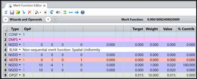 在評價函數中,第 7 行計算非零像素上輻照度的標準偏差。這個數字越低,系統(tǒng)的均勻性就越好。第 8 行和第 9 行將總效率限制為大于 0.015。