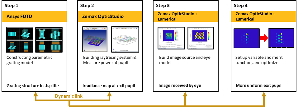 此示例顯示了設置和模擬出瞳擴展器 (EPE) 的工作流程,EPE 是波導型增強現實 (AR) 設備的重要組成部分。該工作流程將利用 Lumerical 和 Zemax OpticStudio 之間的動態(tài)鏈接功能 。為了使用動態(tài)鏈接,在Lumerical中構建了二維六邊形圓柱體和一維傾斜光柵的參數化模型。另一方面,整個成像系統(tǒng)內置于Zemax OpticStudio中。在光線追蹤過程中,當光線照射到光柵上時,Zemax OpticStudio 會自動調用 Lumerical 來計算精確的電場響應,從而可以對系統(tǒng)進行準確評估。
