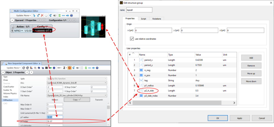 請注意,這些光柵文件包括Lumerical和OpticStudio之間的動態(tài)工作流程所需的一些特殊設置。 例如,通過右鍵單擊對象樹中的頂部單元格,我們可以看到兩個光柵文件中存在名稱為“p#_*****”的用戶屬性。這些用戶屬性將由OpticStudio直接控制。同名的參數將顯示在OpticStudio中。用戶在OpticStudio中對這些參數的任何修改都將反映到Lumerical中的用戶屬性中,以更新光柵幾何形狀。此外,在優(yōu)化過程中,我們也可以更改一些變量以獲得最佳系統(tǒng)性能。