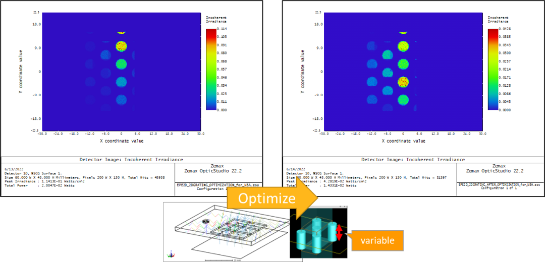 我們可以選擇一些參數來優(yōu)化系統(tǒng)性能。在本演示中,我們將圓柱體高度作為變量,并將中心場的出瞳均勻性作為優(yōu)化目標。