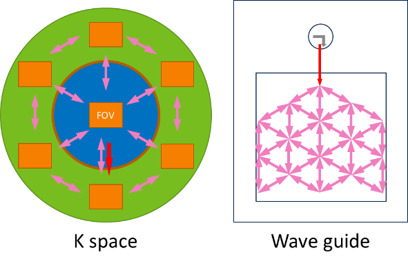 EPE是基于波導的AR系統(tǒng)(如Microsoft Hololens)中最流行的技術之一。它包括一塊薄玻璃板(波導),上面有幾個光柵。光柵的周期、區(qū)域形狀和周期方向通常在 k 空間中規(guī)劃。K 空間是一個二維空間,該空間中的任何單個點始終表示射線傳播方向。當衍射光柵改變光線的傳播方向時,它在該 k 空間中的位置會被矢量移動,其中矢量的長度與周期有關。K-space是一個非常有用的概念,用于規(guī)劃EPE系統(tǒng)的光傳播和光柵周期。