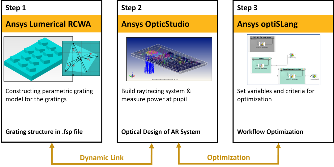 在此工作流程中,我們使用 Lumerical 構(gòu)建光柵模型,并使用 RCWA 求解器模擬其響應(yīng)。完整的EPE系統(tǒng)內(nèi)置于OpticStudio中,并動態(tài)鏈接到Lumerical,以集成精確的光柵模型。外耦合器(OC)是一種具有復(fù)雜結(jié)構(gòu)的二維光柵,其功能在局部進(jìn)行了優(yōu)化。最后,利用optiSLang通過修改光柵模型,對系統(tǒng)級優(yōu)化進(jìn)行整體控制,實現(xiàn)整個EPE系統(tǒng)所需的光學(xué)性能。