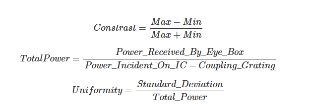 設(shè)置好參數(shù)后,代碼的其余部分包括調(diào)用OpticStudio來追蹤光線并從探測器收集結(jié)果。使用 optiSLang 優(yōu)化系統(tǒng)的另一個好處是后數(shù)據(jù)處理。在這個優(yōu)化過程中,我們不直接優(yōu)化眼盒上的輻照度分布。取而代之的是,我們首先使用瞳孔函數(shù)對輻照度分布進(jìn)行卷積,然后根據(jù)這個卷積結(jié)果設(shè)置優(yōu)化目標(biāo)。在此示例中,優(yōu)化目標(biāo)是對比度、總功率和均勻性,定義如下: