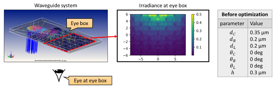 探測器設(shè)置為直接在超頻光柵的輸出端捕獲光線。優(yōu)化的目標(biāo)是增強(qiáng)朝向眼睛的輻照度圖輸出的均勻性,同時最大限度地提高總功率。