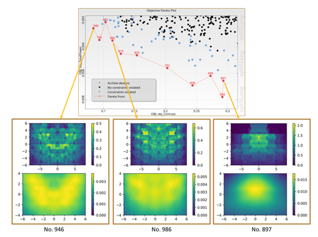 下圖中紅色標(biāo)記的設(shè)計稱為帕累托前。帕累托前沿說明了多個目標(biāo)之間的權(quán)衡,其中沒有一個設(shè)計在性能方面主導(dǎo)另一個目標(biāo)。這意味著所有這些設(shè)計都顯示了多個標(biāo)準(zhǔn)(例如均勻性與總功率)的不同平衡。我們收集了 3 個結(jié)果并在下面顯示它們。對于每個設(shè)計點,對應(yīng)一對圖,分別顯示眼框內(nèi)的對比度和均勻性。