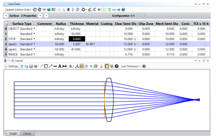 本文所考慮的系統(tǒng)(StartingLens.zmx)由一個(gè)簡(jiǎn)單的雙凸透鏡組成,工作波長(zhǎng)為0.633 nm,像平面位于其近軸焦點(diǎn)處。
