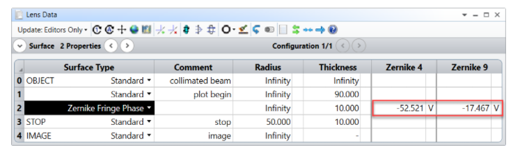 “ OFHSphericalCorrector_1.zmx ”是構(gòu)造文件 1,只包含一個(gè)準(zhǔn)直光束入射透鏡?!?OFHSphericalCorrector_2.zmx ”是構(gòu)造文件 2,它類似于構(gòu)造文件 1,但另外包含一個(gè)位于透鏡前表面前的相位板。該相位板使用 Zernike Fringe 相位表面 (Zernike Fringe Phase surface) 建模,該表面的所有項(xiàng)最初都被設(shè)為零。將分別表示離焦和三階球差的第 4 項(xiàng)和第 9 項(xiàng)設(shè)為變量,以便以后進(jìn)行適當(dāng)?shù)膬?yōu)化。