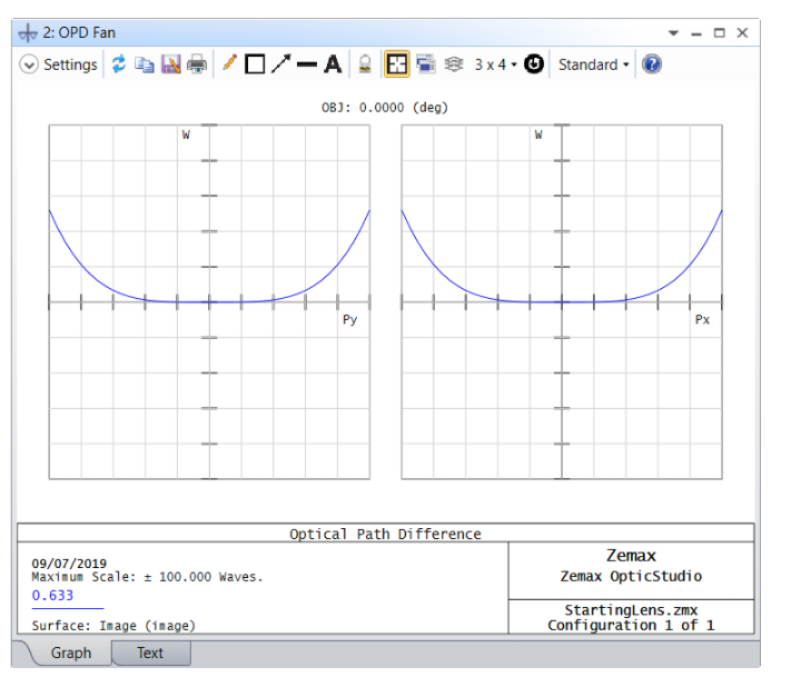 在此階段,由于構(gòu)造文件 2 中的相位板沒(méi)有任何非零項(xiàng),OFH 是由兩束相同的光束的干涉構(gòu)成,對(duì)系統(tǒng)沒(méi)有任何影響。因此,重構(gòu)系統(tǒng)的外觀和性能應(yīng)該與原始的“ StartingLens.zmx ”文件完全相同。