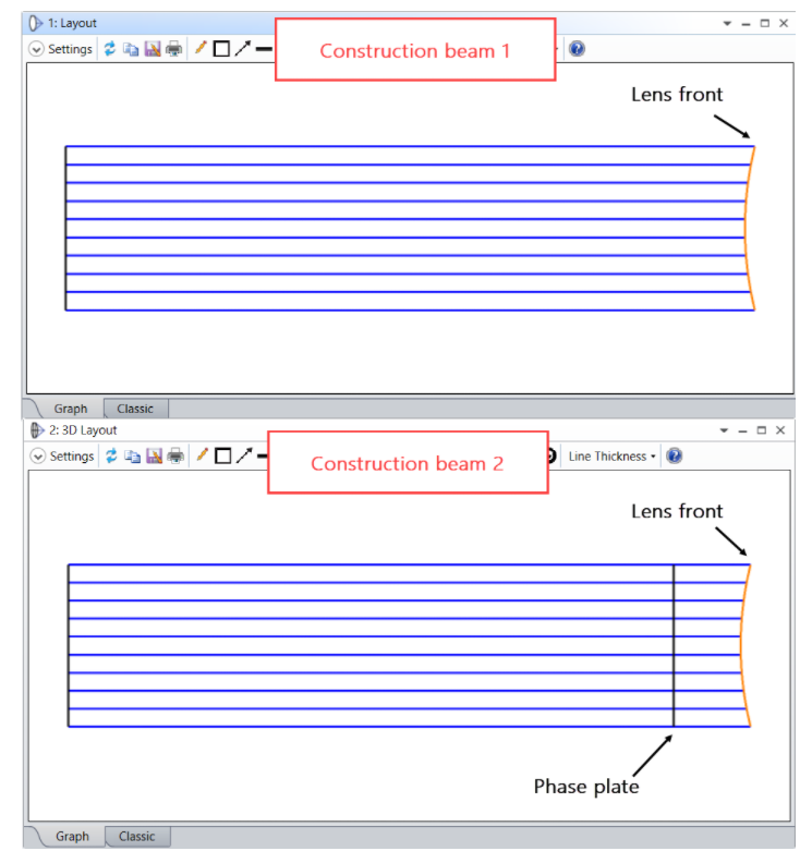 上圖是兩個(gè)構(gòu)造文件只繪制到鏡頭的前表面的布局圖,這也是每個(gè)文件中的系統(tǒng)光闌。光闌代表假定的兩個(gè)構(gòu)造光相互干涉的表面,只有在構(gòu)造文件中光闌位置處的光線交互位置的向量才能決定全息圖的屬性。從 OFH 的角度來(lái)看,構(gòu)造文件中所有在光闌后的表面都將被忽略,所以光闌后的表面在布局圖中為了清晰顯示都被隱藏了。