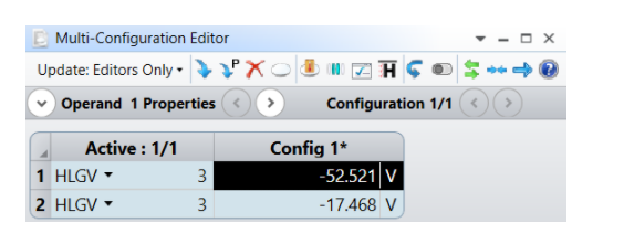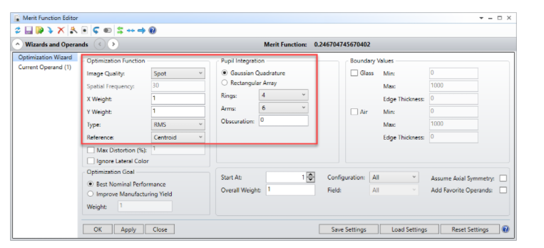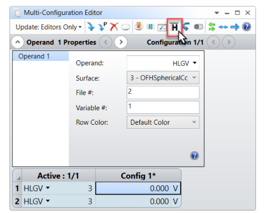 增加全息變量 (Add Hologram Variables) 可以在構(gòu)造文件中查找變量,并將它們作為 HLGV 多重結(jié)構(gòu)操作數(shù)添加到重現(xiàn)文件中。這些變量現(xiàn)在可以與重現(xiàn)文件中的任何其他變量一起使用(如果有的話)。在本例中,將添加4個(gè) HLGV 操作數(shù),2個(gè)用于構(gòu)造文件1,2個(gè)用于構(gòu)造文件2。我們只對(duì)構(gòu)造文件2的操作數(shù)感興趣(它已經(jīng)應(yīng)用了變量求解 'V'),所以刪除構(gòu)造文件1的操作數(shù)。使用 HLGV 操作數(shù)允許同時(shí)優(yōu)化構(gòu)造和重現(xiàn)系統(tǒng)。注意, HLGV 報(bào)告的變量不是只讀的,更改它們的值將更改構(gòu)造文件中的相關(guān)參數(shù)。為了優(yōu)化系統(tǒng)以獲得最佳性能,將使用以最佳 RMS 光斑尺寸為評(píng)價(jià)函數(shù)目標(biāo)。為此,按如下方式設(shè)置優(yōu)化向?qū)?,然后單?OK: