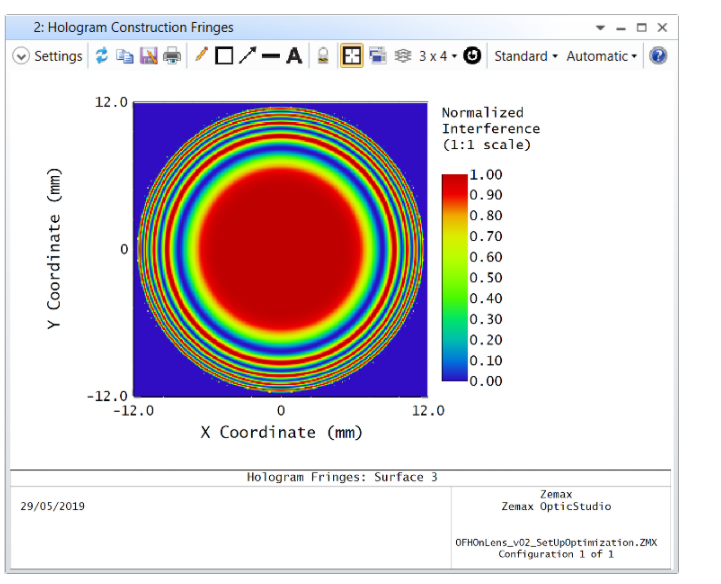 通過(guò)在單透鏡的前表面放置光學(xué)全息圖 (OFH),可將其性能優(yōu)化至衍射極限。OFH 需要使用三個(gè) ZMX 文件: