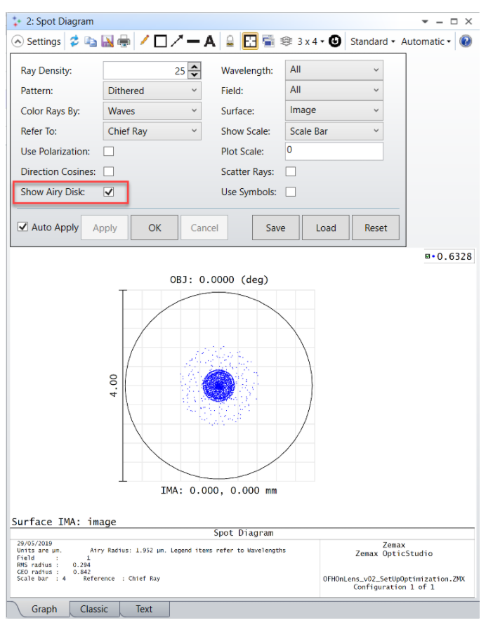 顯示艾里斑 (Airy disk) 的標(biāo)準(zhǔn)點(diǎn)列圖,可以用來(lái)快速確認(rèn)該系統(tǒng)現(xiàn)在是否處于衍射極限。由于存在高階像差,該點(diǎn)不是一個(gè)理想的像點(diǎn)。