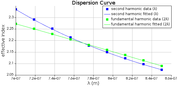 第一步是計(jì)算有效的非線性模態(tài)重疊面積,這決定了非線性相互作用的強(qiáng)度。然后,泵浦光/信號(hào)光和閑置光的色散曲線,然后進(jìn)行二次擬合。