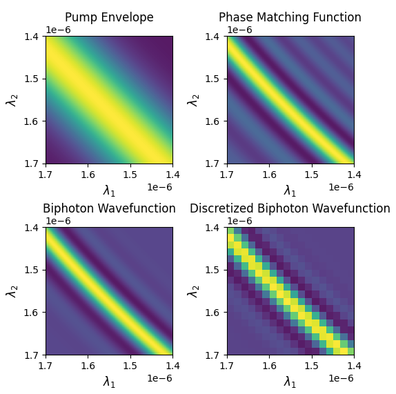 在此步驟中,使用上一步中的參數(shù)計(jì)算光子對(duì)生成速率和雙光子波函數(shù)。圖中顯示了用戶定義的泵包絡(luò)函數(shù),以及根據(jù)源幾何形狀確定的相位匹配功能。這些的乘積是雙光子波函數(shù),如下圖所示。最后,還顯示了頻率離散化的雙光子波函數(shù),該波函數(shù)可用作qINTERCONNECT中電路的輸入,如下一步所示。