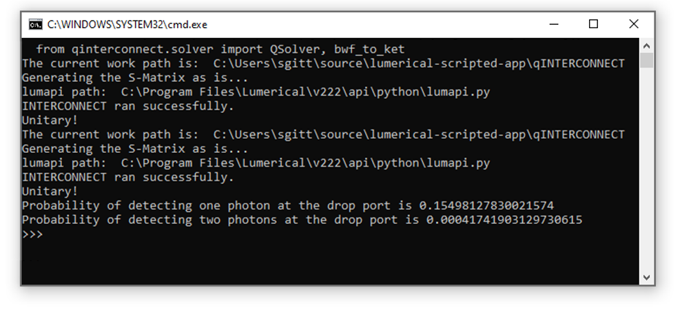 雙光子波函數(shù)用于生成一個(gè) ket 矢量,該矢量以離散頻率 Fock 為基礎(chǔ)描述發(fā)射光子的狀態(tài)。然后,將ket矢量用作qINTERCONNECT中下環(huán)濾波器的輸入。運(yùn)行 python 腳本將執(zhí)行模擬并顯示以下窗口,顯示從環(huán)的下降端口檢測(cè)一個(gè)或兩個(gè)光子的成功概率。
