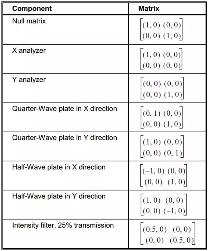 下表為一些典型偏振器件的瓊斯矩陣參數(shù),該表格取自用戶手冊“The Setup Tab”一章: