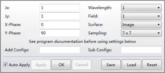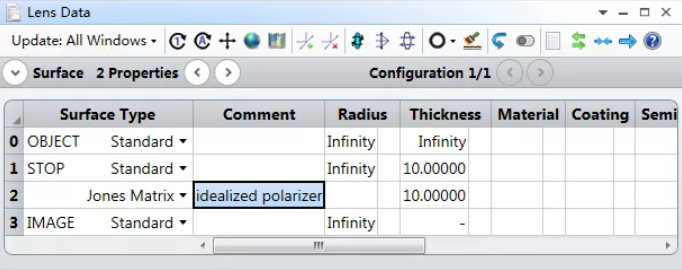 需要注意的是:瓊斯矩陣表面不使用曲率半徑這一參數(shù),該表面類型總是一個平面。這是因為該類型表面通常都是在垂直入射的平行光中使用。矩陣的每個參數(shù)可以在透鏡數(shù)據(jù)編輯器中的參數(shù)欄中輸入。在示例系統(tǒng)中,瓊斯矩陣設置為X軸方向的四分之一波片: