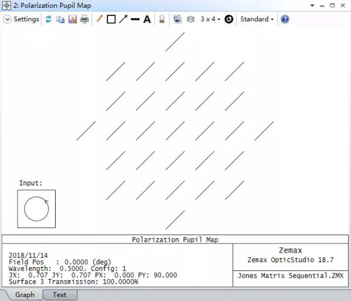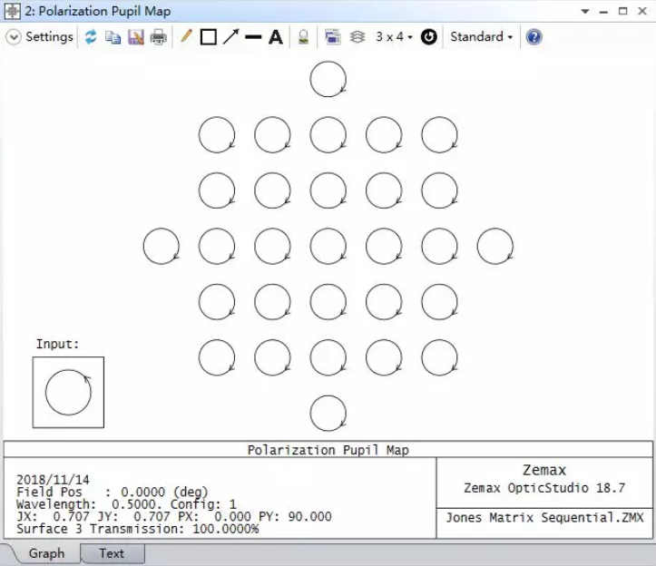 最簡單直接的觀察瓊斯矩陣表面所產(chǎn)生的影響的方法是使用偏振光瞳圖 (Polarization Pupil Map) 功能。該功能位于分析 (Analysis) 選項卡 > 偏振 (Polarization) 菜單中。打開該工具,設置輸入光的偏振態(tài)為左旋圓偏振光: