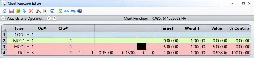 在添加了這個(gè)變量之后,與其他情況類似我們需要在評(píng)價(jià)函數(shù)中加入邊界限制條件,以保證優(yōu)化器不會(huì)得到一個(gè)不符合實(shí)際要求的解。添加多重結(jié)構(gòu)操作數(shù)MCOG(多重結(jié)構(gòu)操作數(shù)大于)并設(shè)為0以及多重結(jié)構(gòu)操作數(shù)MCOL(多重結(jié)構(gòu)操作數(shù)小于)并設(shè)為+5,確保它們的權(quán)重不為0,這會(huì)將切趾因子的變化限制在0到5之間。