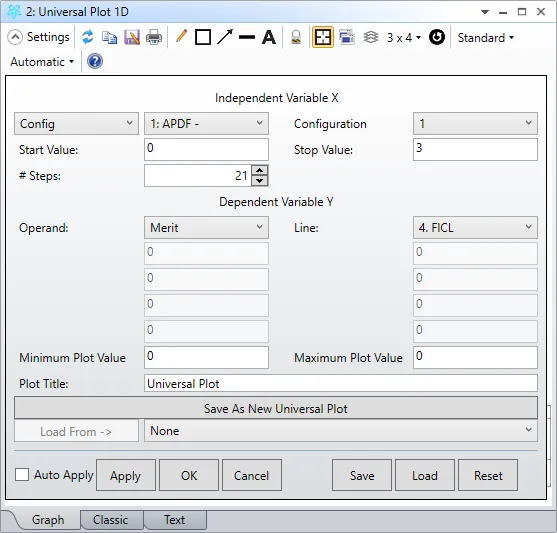 同樣的方法也適用于在通用繪圖中把原本不可以設(shè)為變量的參數(shù)設(shè)為變量。在本例中,我們可以繪制優(yōu)化操作數(shù)FICL與切趾因子之間的關(guān)系曲線圖。打開(kāi)一維通用繪圖 (Universal Plot 1D),依次點(diǎn)擊分析菜單中的通用繪圖工具 (Universal Plot),1-維 (Universal Plot 1D),新建 (New)) 并如下圖進(jìn)行設(shè)置。