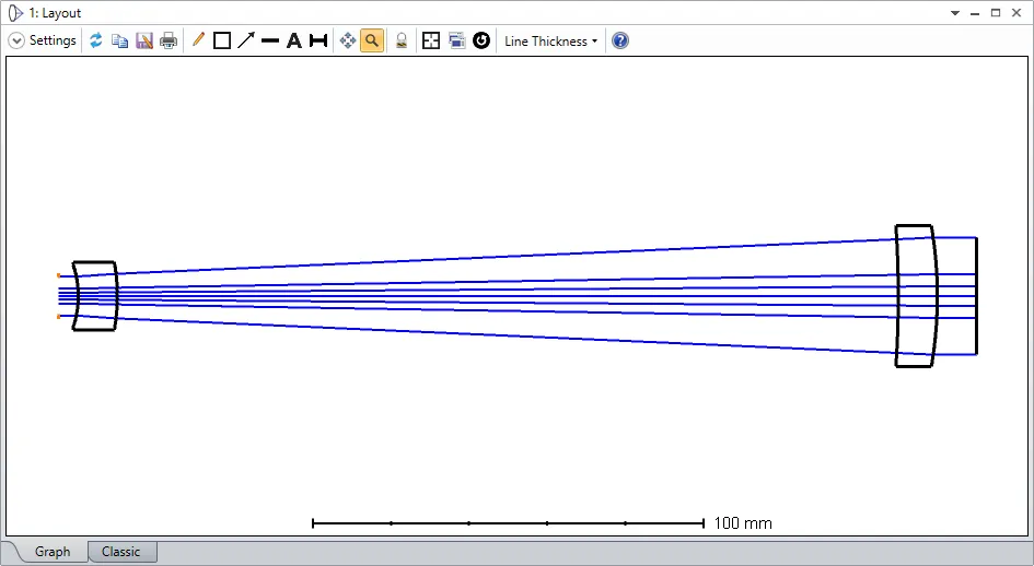 在本文提供的示例文件中打開(kāi)Beam expander.ZAR文件。該系統(tǒng)為放大率是3倍的擴(kuò)束系統(tǒng),該系統(tǒng)已優(yōu)化至能在波長(zhǎng)為632.8nm的條件下輸出準(zhǔn)直的光束。假設(shè)在激光諧振腔中存在一些能夠影響輸出波長(zhǎng)的不穩(wěn)定因素,那么該系統(tǒng)對(duì)輸入波長(zhǎng)有多敏感呢?