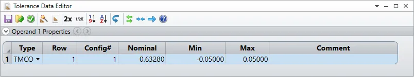 然后在公差菜單中打開(kāi)公差數(shù)據(jù)編輯器 (Tolerance Data Editor),如下圖所示定義一個(gè)公差操作數(shù)TMCO。在本例中,我們只關(guān)注系統(tǒng)對(duì)波長(zhǎng)的靈敏度,假設(shè)波長(zhǎng)的變動(dòng)范圍是±50nm。