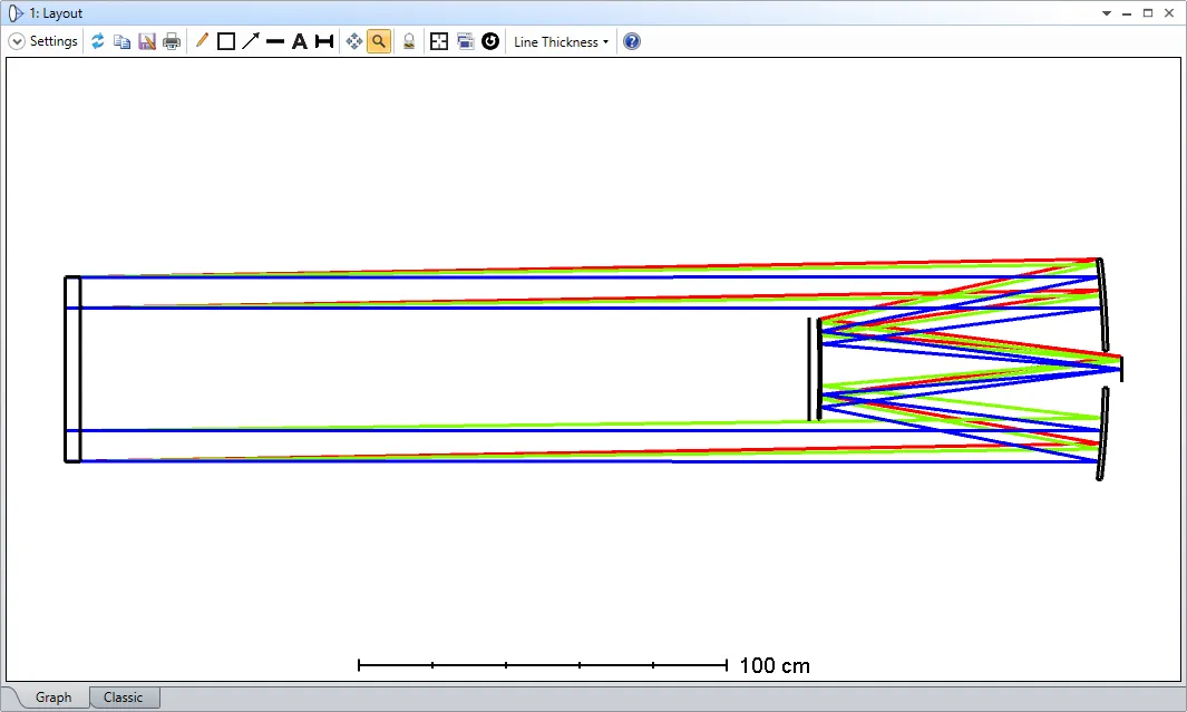 在本文提供的示例文件中打開(kāi)Schmidt-Cassegrain Telescope.ZAR文件。該文件模擬了一個(gè)包含校正透鏡的雙反望遠(yuǎn)鏡系統(tǒng)。在序列模式中,我們?cè)谛U哥R后面設(shè)置一個(gè)單獨(dú)的表面,來(lái)模擬系統(tǒng)中次級(jí)反射鏡造成的孔徑遮闌。理想狀態(tài)下,遮闌的大小應(yīng)該和次級(jí)鏡面的大小一致。我們可以手動(dòng)設(shè)置它的大小,但如果希望對(duì)其進(jìn)行優(yōu)化和公差分析,則將其設(shè)為求解值是更好的選擇。