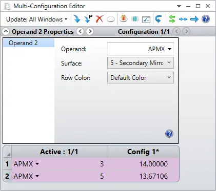 在多重結(jié)構(gòu)編輯器中定義兩個(gè)多重結(jié)構(gòu)操作數(shù)APMX(最大孔徑)來(lái)控制表面3和5的最大孔徑。表面3上有一個(gè)圓形的遮闌,所以它的最大孔徑定義了遮闌的大小。表面5有一個(gè)圓形孔徑,所以最大孔徑即定義了該表面孔徑的大小。