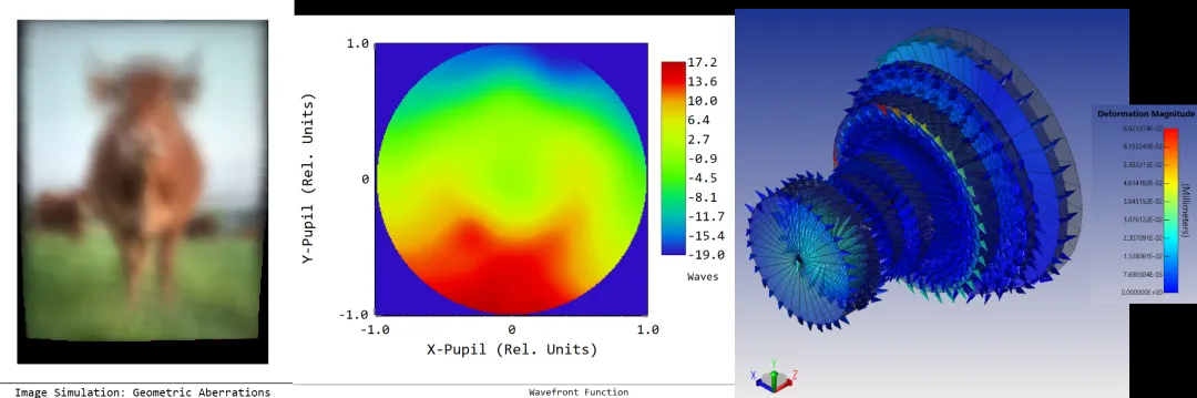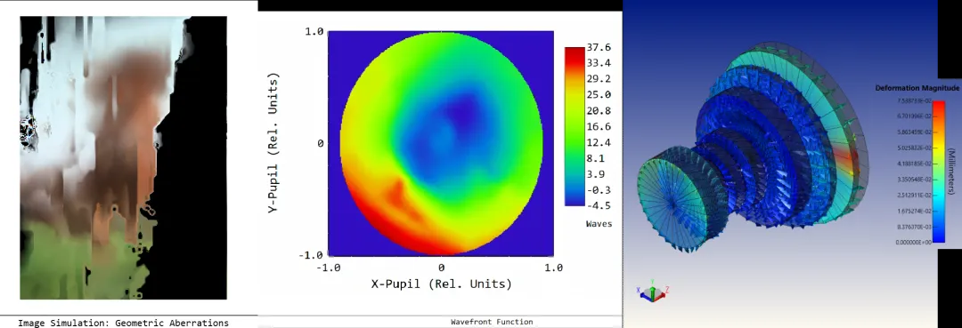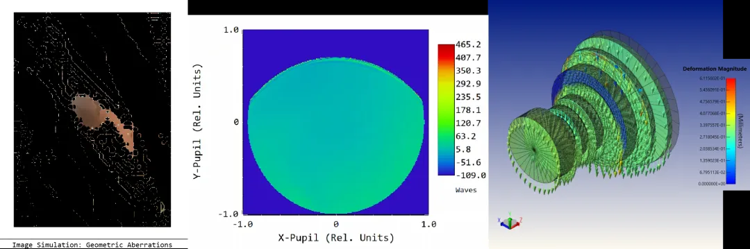 由于透鏡系統(tǒng)已經(jīng)針對這種狀態(tài)進(jìn)行了優(yōu)化,所以圖像模擬的質(zhì)量非常好。波前誤差是旋轉(zhuǎn)對稱的,最大誤差為0.225波。沒有顯示變形,因為此時沒有應(yīng)用多物理數(shù)據(jù)。這將作為基線和性能的“理想”狀態(tài)。