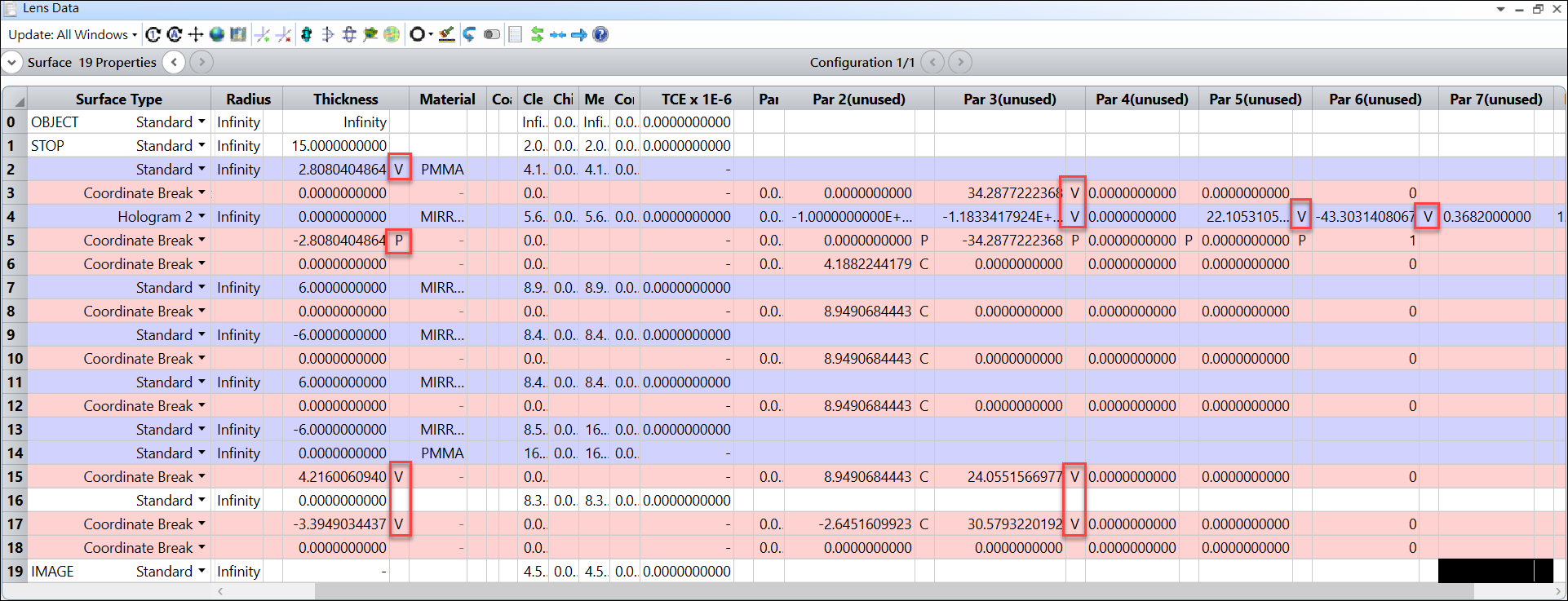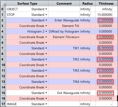 為了便于優(yōu)化,我們首先在表面 13(設(shè)置材料為PMMA)之后添加一個虛擬面。這個曲面將被用作一個參考曲面,以確保系統(tǒng)的幾何形狀是正確的。接下來,在表面 17 的波導(dǎo)出口之后添加一個坐標(biāo)間斷面,然后將現(xiàn)有的表面厚度剪切并粘貼到新的坐標(biāo)間斷面厚度,這個新表面將用于傾斜像面。