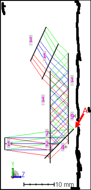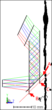 首先,我們將防止全息圖與波導(dǎo)的側(cè)面重疊,從下圖你可以看到點(diǎn) A 在表面 9 的右邊。利用 RAGZ 求出曲面 4 上點(diǎn) A 的位置,并約束其 Z 位置小于曲面 9 的 Z 位置。其次,從波導(dǎo)入口到全息圖的距離必須是正值,使用 PLEN 操作數(shù)確保這個長度應(yīng)該大于 0。
