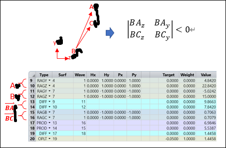 第二,我們將點(diǎn) A 限制在如圖所示直線 BC 的左邊,這里要用到的一個有用的概念是向量積。根據(jù)右手規(guī)則,如果你想讓直線 BA 保持在直線 BC 的左邊,那么訣竅就是計(jì)算出直線 BA 和直線 BC 的行列式作為判定標(biāo)準(zhǔn),并且目標(biāo)值小于零。用 RAGY 和 RAGZ 求點(diǎn) B 和點(diǎn) A 的坐標(biāo),用 RAGB 和 RAGC 操作數(shù)可以很容易地求出直線 BC 的單位向量。