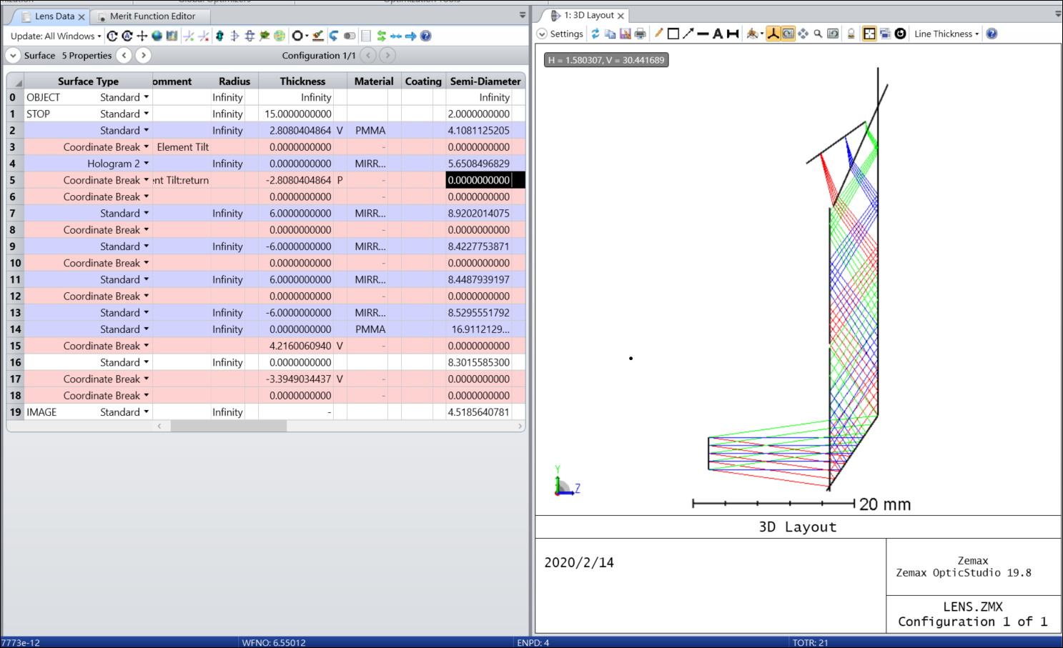 其次,將全息圖 2 表面的構(gòu)造 Z1、Y2、Z2 參數(shù)設(shè)置為變量,使構(gòu)造光可被修改。第三,將表面 15 和表面 17 的厚度和這兩個面關(guān)于 X 的傾斜度設(shè)置為變量,使波導(dǎo)的出口面可以移動和傾斜。