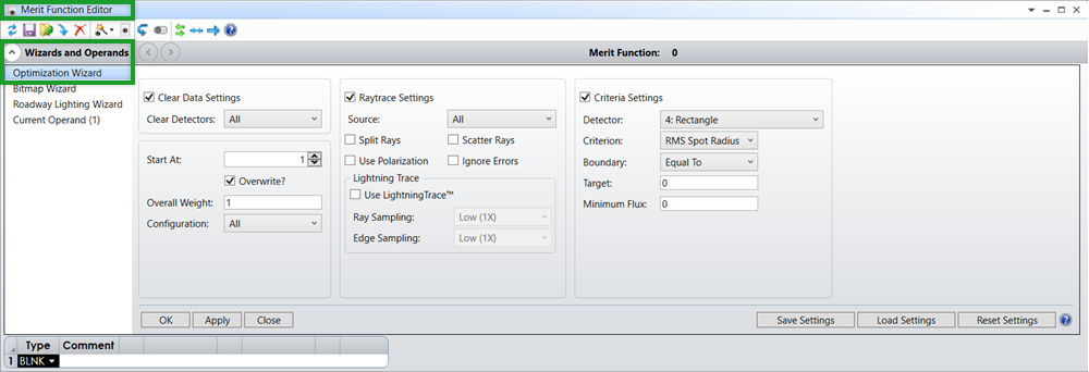 必要的操作數(shù)已被添加到評(píng)價(jià)函數(shù)中。注意,對(duì)話框保持打開(kāi)狀態(tài),“清除數(shù)據(jù)設(shè)置”和“光線追跡設(shè)置”現(xiàn)已被禁用。我們目標(biāo)的任何其他性能都不需要再次定義這些操作數(shù)。此外,“起始行”值已被更新當(dāng)前定義的操作數(shù)之后,所以此后添加的任何評(píng)價(jià)函數(shù)都將出現(xiàn)在當(dāng)前存在的操作數(shù)之后。