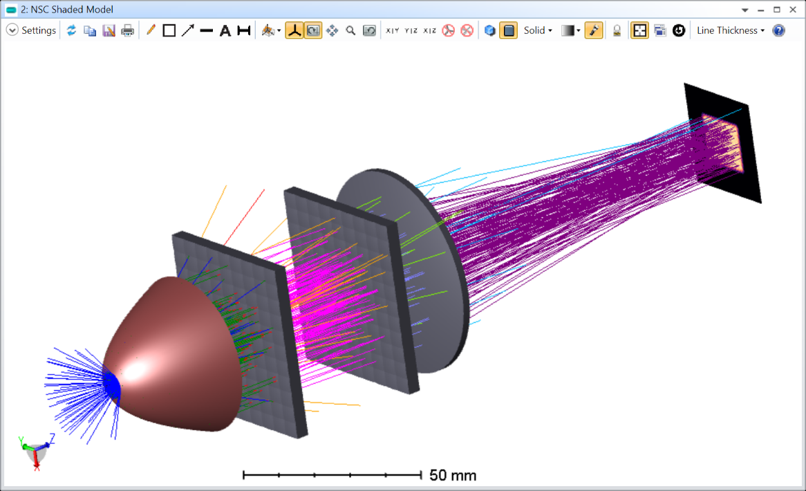 “{Zemax}\Samples\Non-sequential\Miscellaneous\Digital_projector_flys_eye_homogenizer.zmx.”。顧名思義,該系統(tǒng)被設(shè)計(jì)用于數(shù)字投影儀,其中透鏡陣列通過(guò)模擬多個(gè)光源而不是一個(gè)非均勻光源來(lái)均勻化光束。