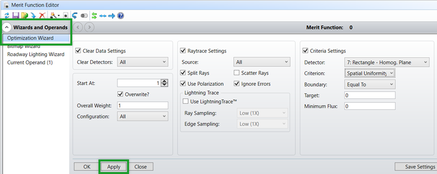 對(duì)于任何投影系統(tǒng)來(lái)說(shuō),最重要的兩個(gè)性能是光通量均勻性和效率。我們可以構(gòu)建一個(gè)以這兩種性能為目標(biāo)的評(píng)價(jià)函數(shù)。打開(kāi)評(píng)價(jià)函數(shù)編輯器并打開(kāi)優(yōu)化向?qū)?。如前文所述操作,“清除?shù)據(jù)設(shè)置”和“清除探測(cè)器:”設(shè)置應(yīng)該保持原樣。在光線追跡設(shè)置下,勾選啟用分裂光線 (Split Rays),使用偏振 (Use Polarization),和忽略錯(cuò)誤 (Ignore Errors)。我們的目標(biāo)是最終的像平面,所以從目標(biāo)設(shè)置中選擇探測(cè)器對(duì)象7。我們將“空間均勻度 (Spatial Uniformity)”定義為評(píng)價(jià)標(biāo)準(zhǔn),邊界條件為“等于”零。注意,這實(shí)際上是針對(duì)光通量分布的標(biāo)準(zhǔn)差設(shè)置,因此零這個(gè)值代表完全均勻。保留所有其他設(shè)置的默認(rèn)值并點(diǎn)擊應(yīng)用 (Apply)。創(chuàng)建的對(duì)話框和設(shè)置的評(píng)價(jià)函數(shù)如下圖所示:
