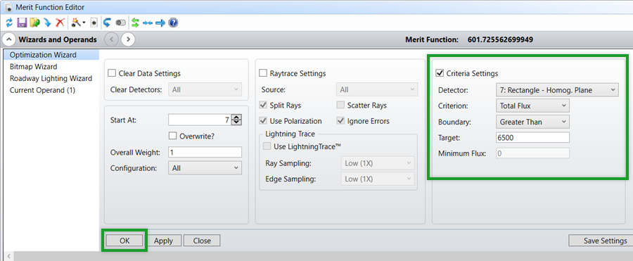 “標(biāo)準(zhǔn)設(shè)置 (Criteria Settings)”定義了評(píng)價(jià)函數(shù)的計(jì)算目標(biāo)。下拉對(duì)話框中顯示的可用標(biāo)準(zhǔn)基于指定的探測(cè)器。邊界條件可以通過(guò)“邊界”下拉菜單選擇,然后在文本框中可以定義評(píng)價(jià)目標(biāo)(不管是閾值還是確切目標(biāo))。此外“最小光通量 (Minimum Flux)”也應(yīng)當(dāng)設(shè)置,這對(duì)于避免優(yōu)化時(shí)出現(xiàn)沒(méi)有光線入射到探測(cè)器的方案是十分必要的。如果在探測(cè)器上沒(méi)有光線的情況下仍有機(jī)會(huì)達(dá)到最小光通量目標(biāo),那么這個(gè)值應(yīng)該設(shè)置為非零值,不然優(yōu)化向?qū)г谏稍u(píng)價(jià)函數(shù)時(shí)將忽略這個(gè)評(píng)價(jià)標(biāo)準(zhǔn)。