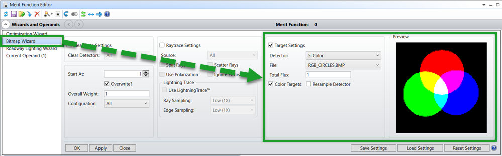 非序列 BMP 位圖向?qū)且粋€(gè)專(zhuān)門(mén)用于定位探測(cè)器上復(fù)雜的光通量和顏色分布的工具。窗口中的大多數(shù)設(shè)置,如下圖所示,與前面討論的評(píng)價(jià)功能工具相同,而這里的區(qū)別在于“目標(biāo)設(shè)置 (Target Settings)”部分。