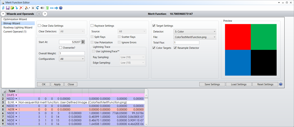 當(dāng)啟用彩色測(cè)試靶時(shí),OpticStudio 將為每個(gè)像素添加三個(gè)目標(biāo)操作數(shù)。這些目標(biāo)對(duì)應(yīng)每個(gè)像素的 X 、 Y 和 Z 三刺激值。此外,添加一個(gè)總光通量操作數(shù)以確保絕對(duì)光通量是測(cè)試探測(cè)器面的。用這種方式定義目標(biāo)似乎有些單調(diào)乏味,但是這種針對(duì)單個(gè)像素的方法非常有效。一旦光線被追跡,OpticStudio 可以非??焖俚卮_定任何像素的顏色和強(qiáng)度。最耗時(shí)的優(yōu)化部分是光線追跡,在此之后數(shù)據(jù)則容易計(jì)算。