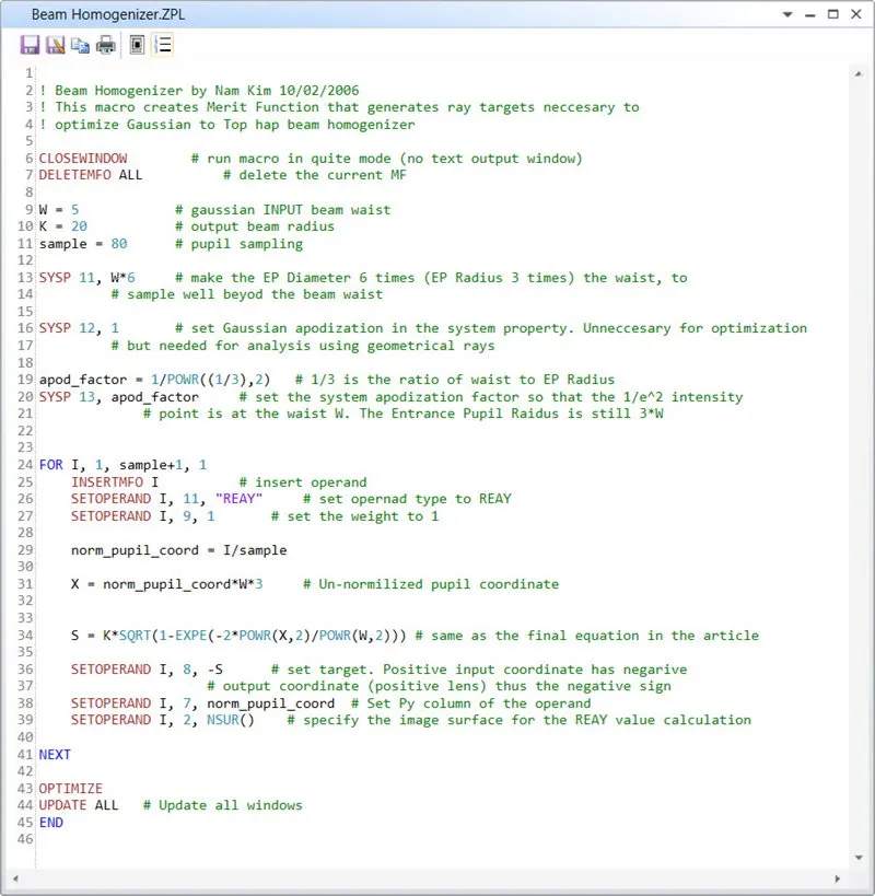 請(qǐng)將示例文件中的宏程序 Beam Homogenizer.ZPL 拷貝到你的 Zemax 宏程序目錄下({Zemax}/Macro folder)。