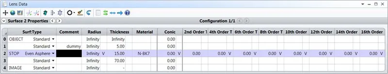 打開附件中的鏡頭文件 Beam_Homogenizer.ZMX。示例系統(tǒng)為一個(gè)前表面為偶次非球面面型的平凸透鏡。優(yōu)化變量為曲率、圓錐系數(shù)和偶次非球面的系數(shù)。系統(tǒng)工作波長為0.623μm(HeNe),玻璃材料為 N-BK7。