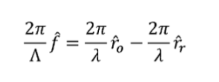 對(duì)于條紋密度,這種計(jì)算是基于全息圖表面上給定點(diǎn)上構(gòu)造光向量(光線方向余弦)的差值和構(gòu)造光束波長的差值。在自由空間中,干涉如下描述: