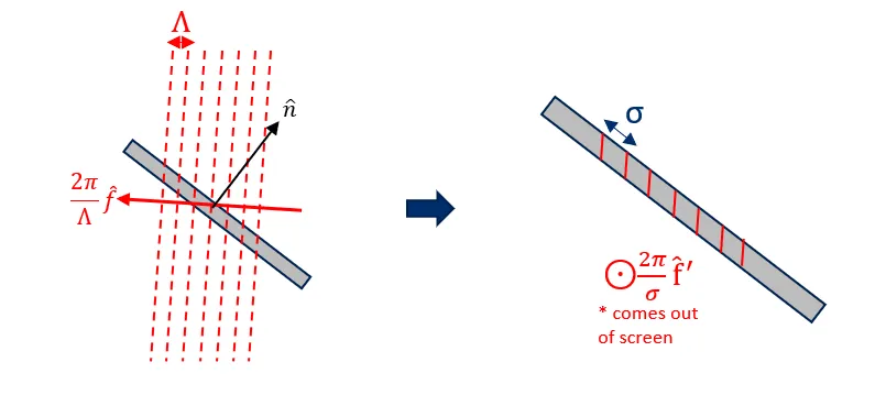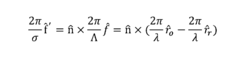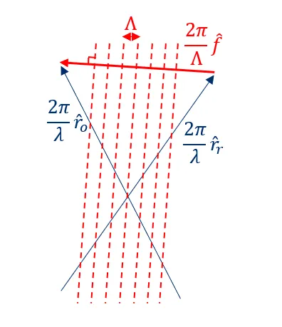 在該表達(dá)式中,Λ 為條紋間距(密度的倒數(shù)),ro 和 rr 是構(gòu)造光向量,f 是條紋面的正交方向。如圖所示,其中紅色虛線表示自由空間中的干涉條紋: