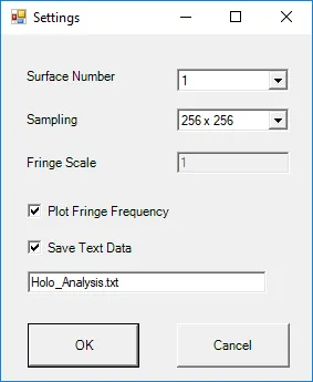 全息圖分析允許用戶繪制條紋頻率(每透鏡單位的條紋),或者直接在規(guī)范化尺度上顯示構(gòu)造光束的干涉條紋。分析設(shè)置如下: