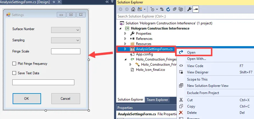 在界面中,ZOS-API 自定義分析的設(shè)置窗口會(huì)像其他分析窗口一樣初始化,可以從窗口左上角的“ 設(shè)置 ”下拉列表中打開。點(diǎn)擊按鈕初始化 User analysis.exe 文件,但是使用不同的模式調(diào)用它,以避免調(diào)用 RunUserAnalysis 函數(shù),而是調(diào)用 ShowUserAnalysisSettings 函數(shù)。在附加的源代碼中,這個(gè)輔助功能可以在文件的底部附近找到。在這個(gè)函數(shù)中,我們初始化了一個(gè)新的設(shè)置表單。在 Visual Studio 中,可以通過在解決方案資源管理器中的 AnalysisSettingsForm.cs 上右鍵單擊并選擇“ 打開 ”來看到設(shè)置窗口: