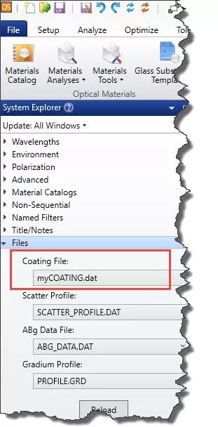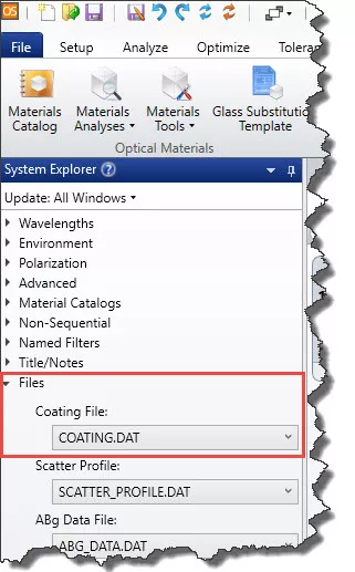 這個膜層可以應用在任何使用當前膜層文件的OpticStudio設計當中,您可以在系統(tǒng)選項 (System Explorer) > 文件 (Files) 中查看當前系統(tǒng)的鍍膜文件: