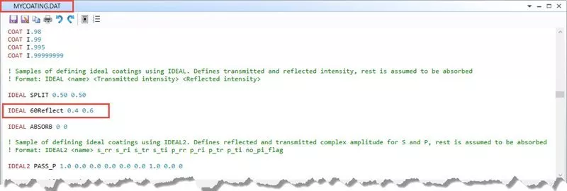 當新的理想膜層輸入到膜層文件后,將文件以適當?shù)拿Q進行保存,例如MYCOATING.DAT。需要注意的是,文件的擴展名必須為 .DAT文件,并保存在與COATING.DAT文件相同的路徑下。